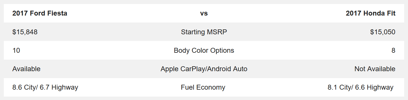 When it comes to the efficiency levels of these hatchbacks' powertrains, the two models are extremely close in performance, almost identical. However, performance is only part of the equation when it comes to choosing your new car. The 2017 Fiesta has so much more to offer drivers when it comes to a sporty design that is fun and functional. The Fiesta has an bold look with a number of wheel options and 10 fun and sleek colors to choose from. The Fit on the other hand features 8 basic colors and has a body style resembling more a petite smart car rather than a sporty hatchback.