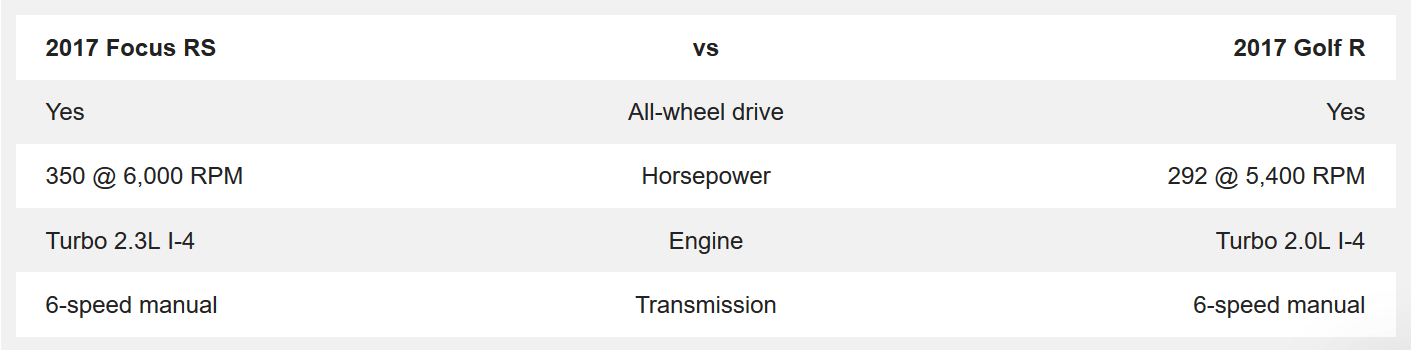 The 2017 Ford Focus RS stays unchanged from the year prior. There’s only one reason somewhere would try and compare the 2017 Focus RS and Golf R: they’re hunting for the best performance sedan on the market! At nearly the identical price, the Ford Focus RS features far more horsepower and torque — that’s what we’re really after, right? The Ford Focus RS puts out impressive torque numbers — significantly more than the 2017 Golf R.