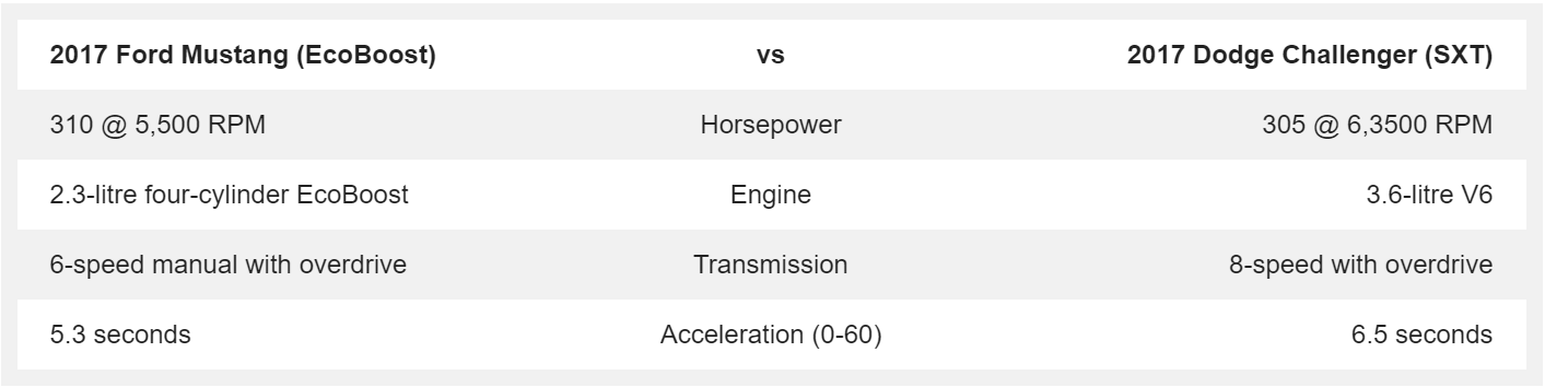 As we can see from the chart below, the 2017 Mustang is able to provide a different experience than the 2017 Challenger. More affordable and more fuel efficient, the 2017 Mustang can squeak out more horsepower with its EcoBoost engine! The Mustang model we have featured comes standard with a manual transmission, more popular with drivers of performance vehicles.