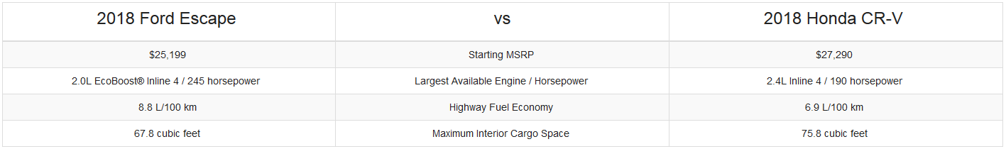 A real and true hallmark of North American – and Canadian in particular – culture is the willingness to pull yourself up by the bootstraps and earn your share with hard work, relentless work ethic, and of course, save enough time for the end of the day to have a little fun. Perhaps this is why vehicles such as the 2018 Ford Escape and 2018 Honda CR-V have become so popular over the years; not only do these crossovers provide great durability and versatility, but their overall construction philosophies lead themselves to be right at home both on and off the beaten path. This has made them endearing favourites to many Canadian drivers, so if you're looking to get in the crossover market today, you might be wondering – is the Escape or CR-V for you?