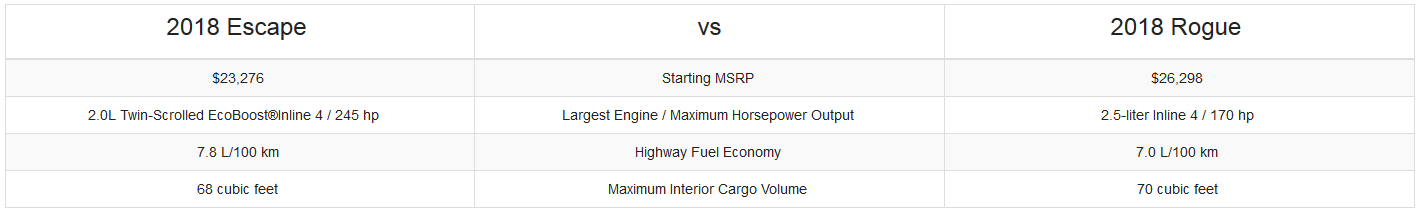 Our Sherwood Ford sales team has taken the liberty of putting together some research on both the 2018 Escape and Rogue models, to give you an inside look at each's benefits. Join our team today and find out which one best suits your needs!