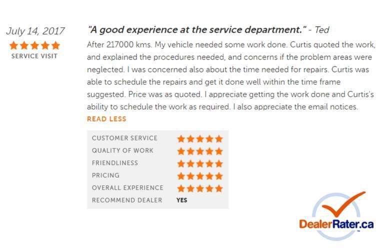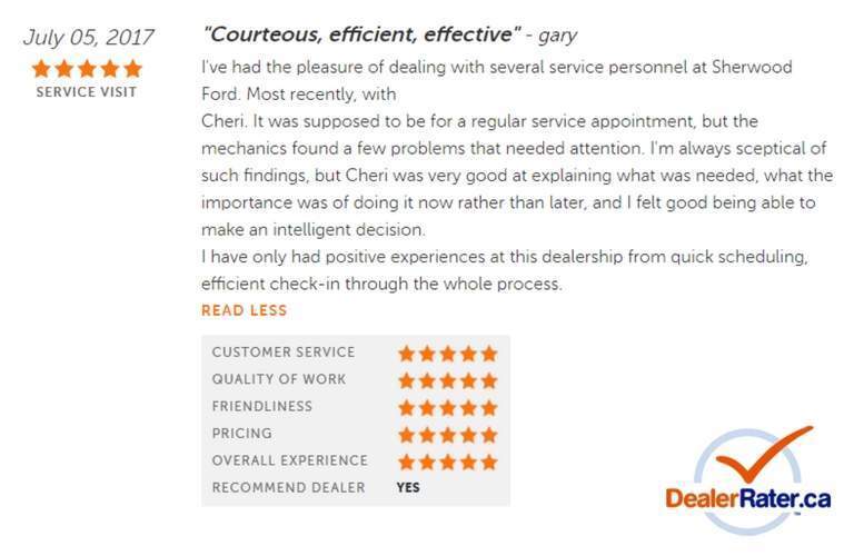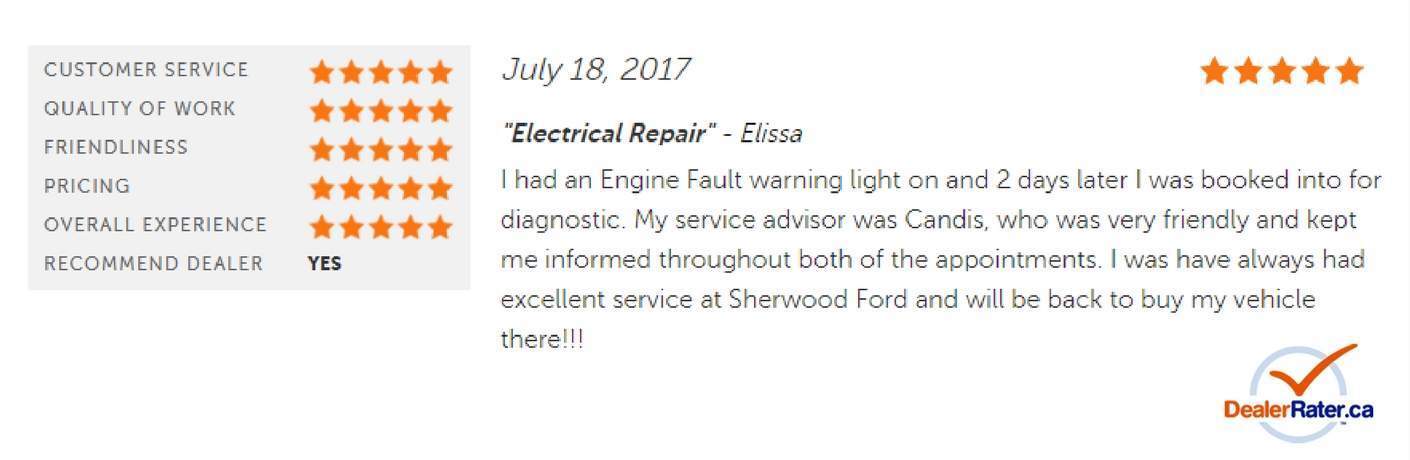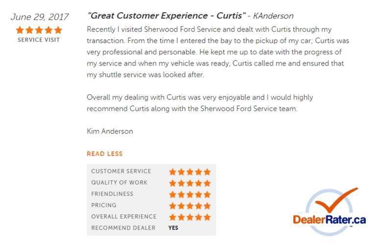 With each customer review posted on DealerRater.ca, customers are asked to rate our team in five different areas. They evaluate our Sherwood Ford Service team on Customer Service, Quality of Work, Friendliness, Pricing and Overall Experience. In each category, visitors to our dealership's service center have rated their experiences with our team as just under five stars. See the average score for each category below.