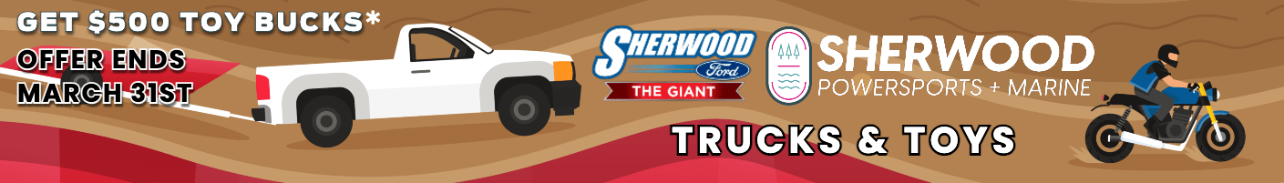 *Buy a truck during Trucks and Toys event at Sherwood Ford, you get $500 off a toy at Sherwood Powersports and Marine towards a purchase over $10,000